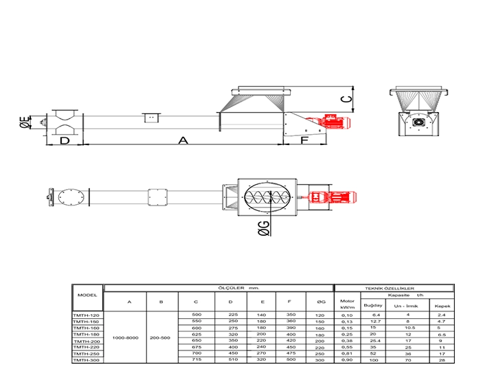 Les systèmes de Convoyeur à Vis Tubulaire Tanış sont offerts en différentes tailles pour répondre aux différents besoins de capacité. Les spécifications techniques de base sont les suivantes :